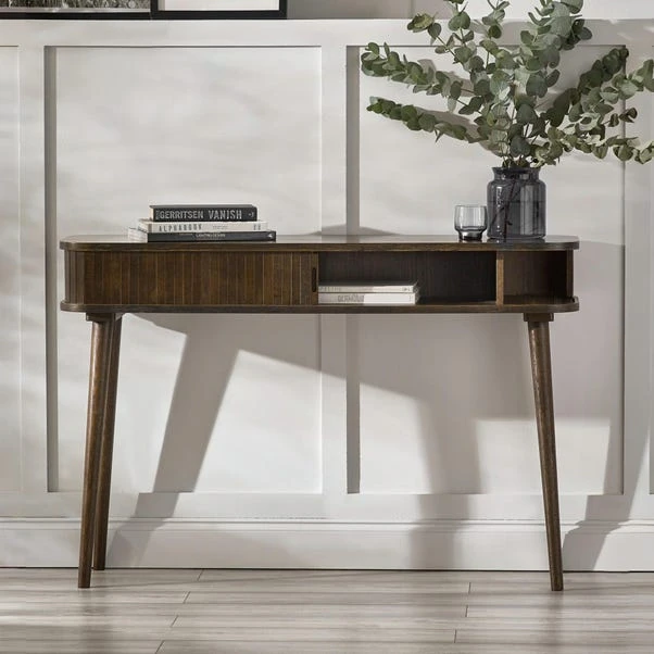 Elegant yet understated, this console table brings a refined presence to hallways or living areas. The deep oak-effect finish is complemented by a sliding slatted door, revealing handy central storage to keep surfaces clear of clutter. Its slim profile and tapered legs lend a sense of lightness and balance to modern or mid-century inspired spaces.
