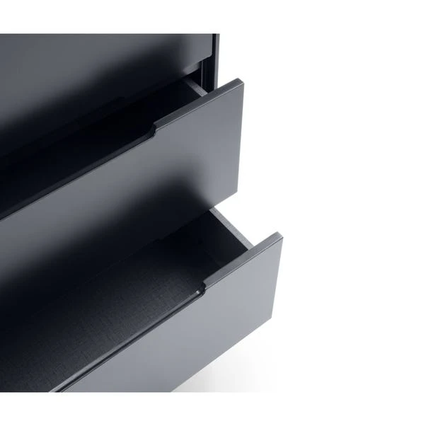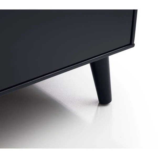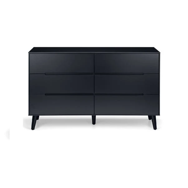 With a retro-inspired design, this wide chest offers both style and ample storage space. Featuring six large drawers in a matt anthracite lacquered finish, it can also serve as a stylish dressing table. The tapered oak finish legs and recessed handles add a touch of sophistication, while the sleek Scandinavian design complements any decor.