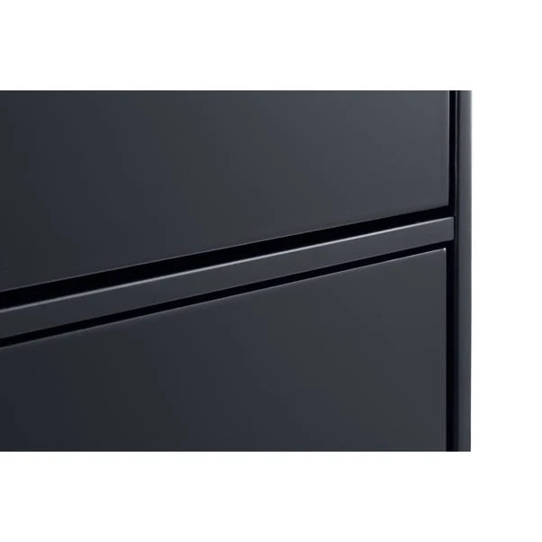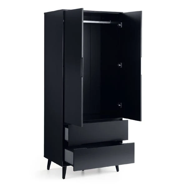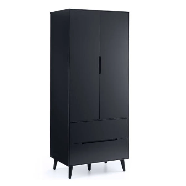 This double wardrobe offers a retro-inspired design with modern storage solutions. Featuring two drawers in a matt anthracite lacquered finish, it provides ample space for your clothing and accessories. The tapered oak finish legs and recessed handles add an elegant touch, while the sleek Scandinavian design complements any decor.