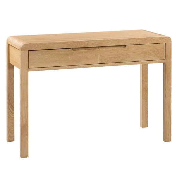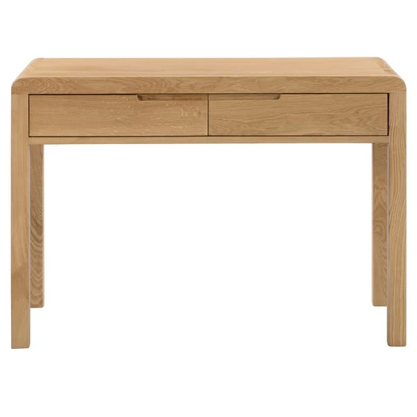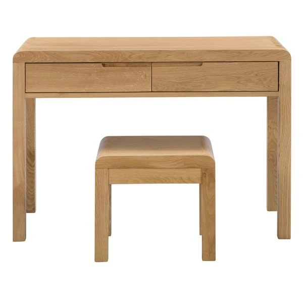 Crafted from solid oak & oak veneers, this dressing table and stool is the perfect combination of classic and contemporary. With beautiful recessed handles and curved edging this dressing table is stunning. Perfect for doing your make up or hair on this table has a handy stool and has a large top, perfect for displaying photo frames, perfume or make up.