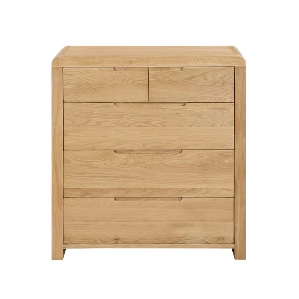 Crafted from solid oak and oak veneers, this chest of drawers is the perfect combination of classic and contemporary. With beautiful recessed handles and curved edging this chest of drawers is stunning. With 5 drawers this chest of drawers is perfect for holding all your clothes. Other matching furniture is also available.