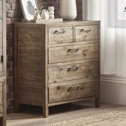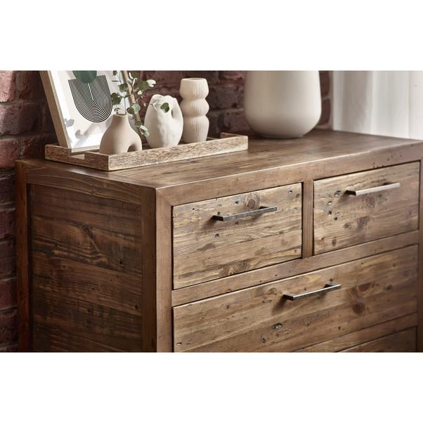 Made from reclaimed and recycled wood, this chest is both unique and eco-friendly. The distressed finish and industrial-style metal handles give it a distinct, rustic character that enhances the aesthetic appeal of your bedroom. With a combination of large and small drawers, it offers versatile storage options for your clothing and accessories.