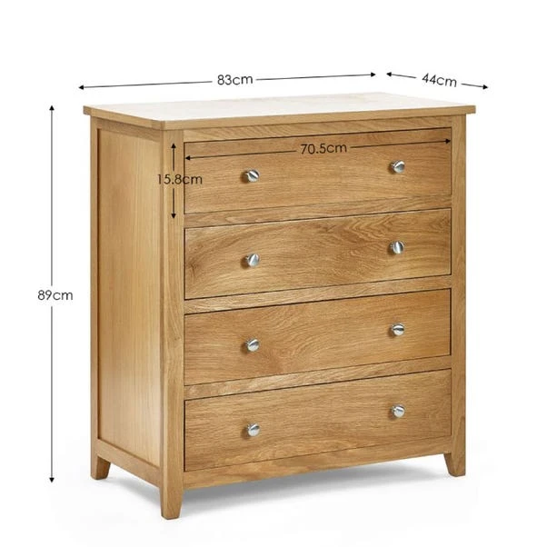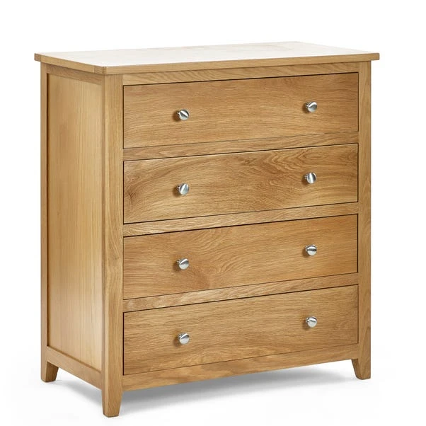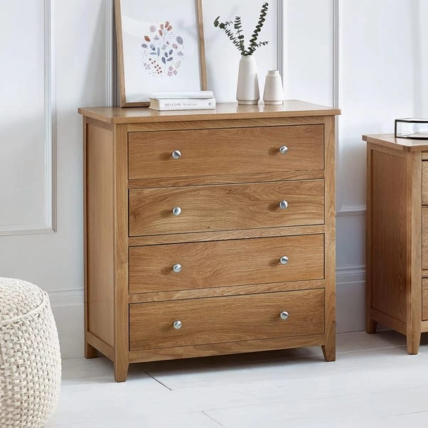 With four generously sized drawers, this chest is perfect for storing clothing and other essentials. Made from solid oak and oak veneers, it combines durability with style. The silver knobs add a sophisticated touch, while the simple design ensures it fits well with any decor.