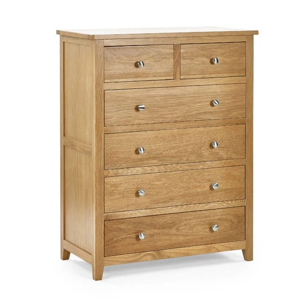 Constructed from solid oak and oak veneers, this chest is designed to last. Featuring two small drawers and four larger ones, it provides a versatile storage solution for your clothing and accessories. The round silver knobs add a touch of elegance to the piece, while its simple yet stylish design ensures it blends well with any bedroom decor.