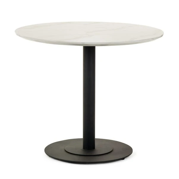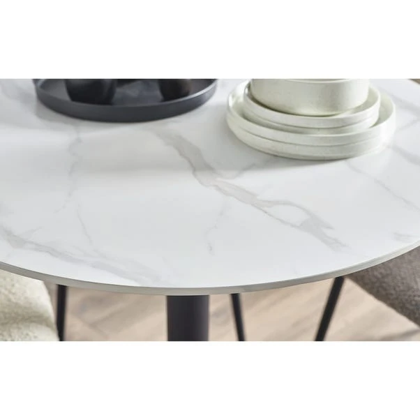 This dining table features a gorgeous marble effect finish with a black pedestal base, creating a contemporary look in your home. The smaller size makes this table perfect for smaller dining areas, offering both style and functionality. This table is a chic and sophisticated addition to any dining space, blending modern design with timeless elegance.