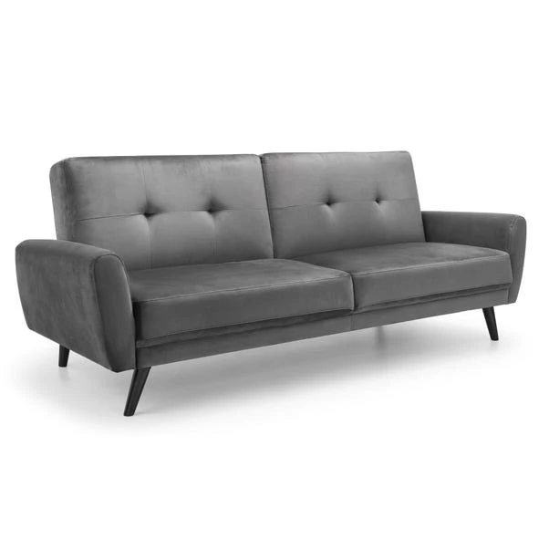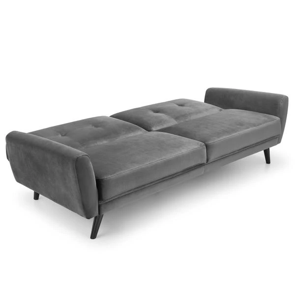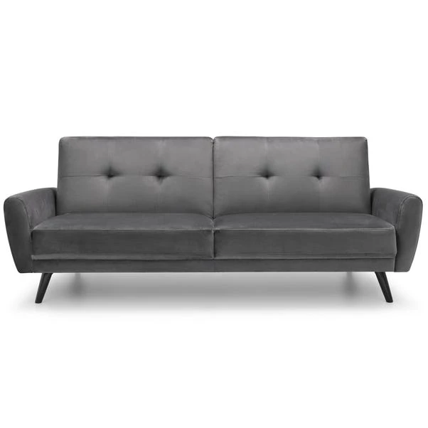 Bring modern retro and scandinavian style to your living space with the Monza Velvet Sofa Bed. Designed with style and comfort in mind, the Monza is upholstered in an undeniably soft and luxurious dark grey velvet fabric, with beautiful pin-tuck detailing on the back cushions that add a retro touch to this sofa bed. The narrow curved oval arms allow this sofa bed to make the most of its seating space, with deep padded foam filled seats and backrests, the Monza will guarantee incredible comfort and support all day long. Thanks to its simple click-clack mechanism, the Monza range can easily be transformed from a three seater sofa into a small cosy double bed, providing maximum relaxation for you and your guests. This sofa bed is complete with a solid steel frame structure and sturdy scandi-style wooden legs finished in black.