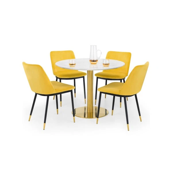 Transport yourself to a stylish 1920s bistro with this Palermo dining set, and dine in art deco grandeur. With an easy wipe-clean marble effect top and striking gold finish metal base, this dining table doesn’t only look good but is easy to maintain, so you can spend more time entertaining and less time cleaning. Paired with the velvet upholstered chairs, you’ll be hard pressed to find somewhere better to enjoy your meals.