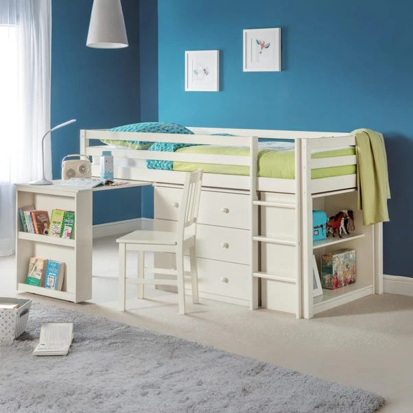 The Roxy Midsleeper Bed is an extremely clever and practical piece of children’s furniture that offers incredible functionality and great value for money. Its compact design is supported by a robust, solid pine framed construction and offers numerous useful features from a handy pull-out desk to ample shelving and cupboard space.